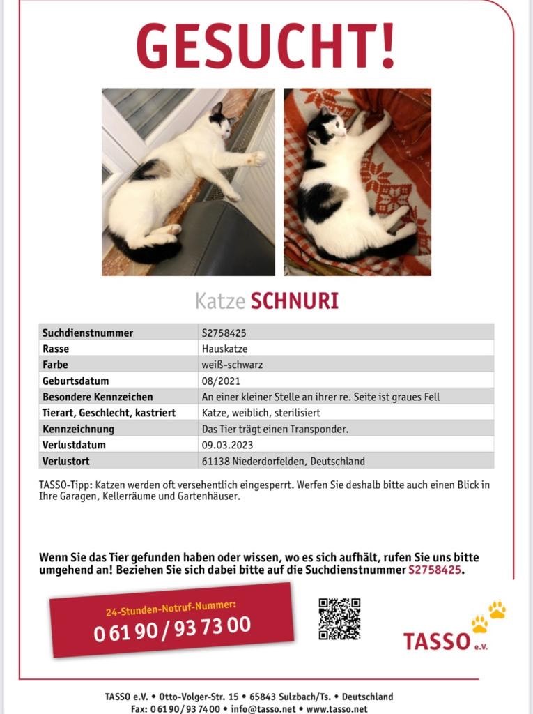 Bitte lassen Sie Ihre Katzen chippen und registrieren. Das erleichtert die Suche sehr und erhöht deutlich die Chance, Ihr Tier wiederzufinden.